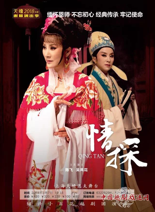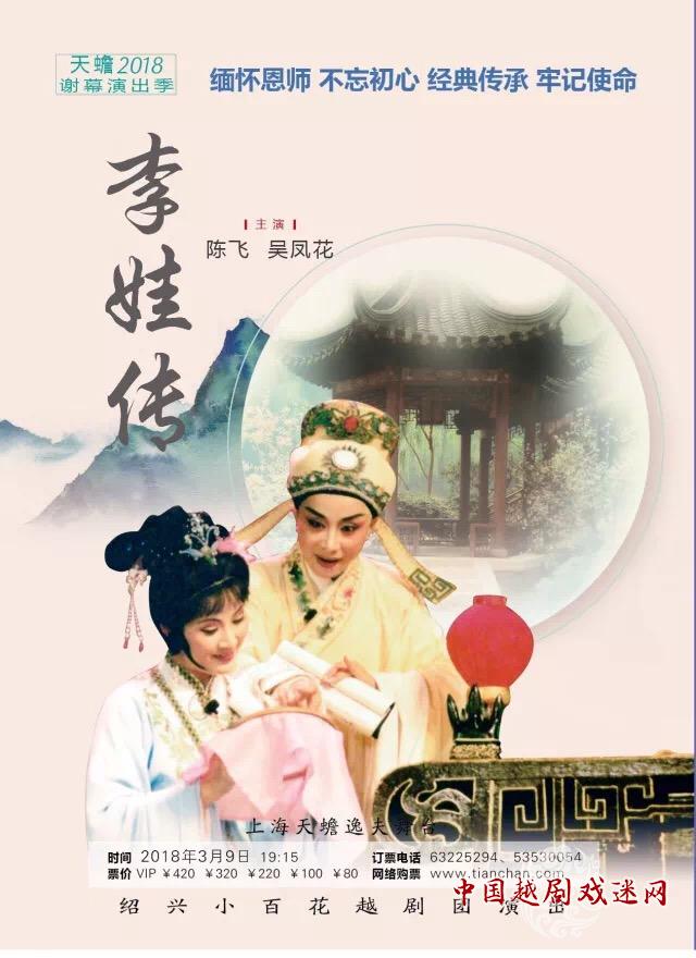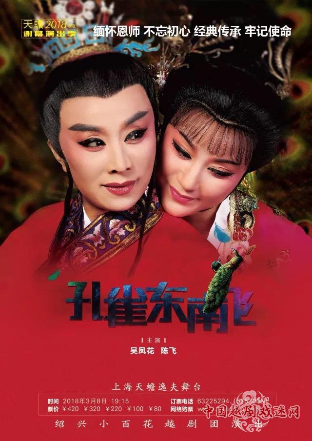 2018年3月6号、7号、8号、9号四天,绍兴“小百花”将携《梁祝》、《情探》、《孔雀东南飞》、《李娃传》四台好戏亮相上海天蟾逸夫舞台作为至上海观众的新春馈礼。这次的演出,既是2018年上海天蟾逸夫舞台的谢幕演出,也是绍兴“小百花”缅怀恩师、不忘初心、传承经典、牢记使命的一次演出。